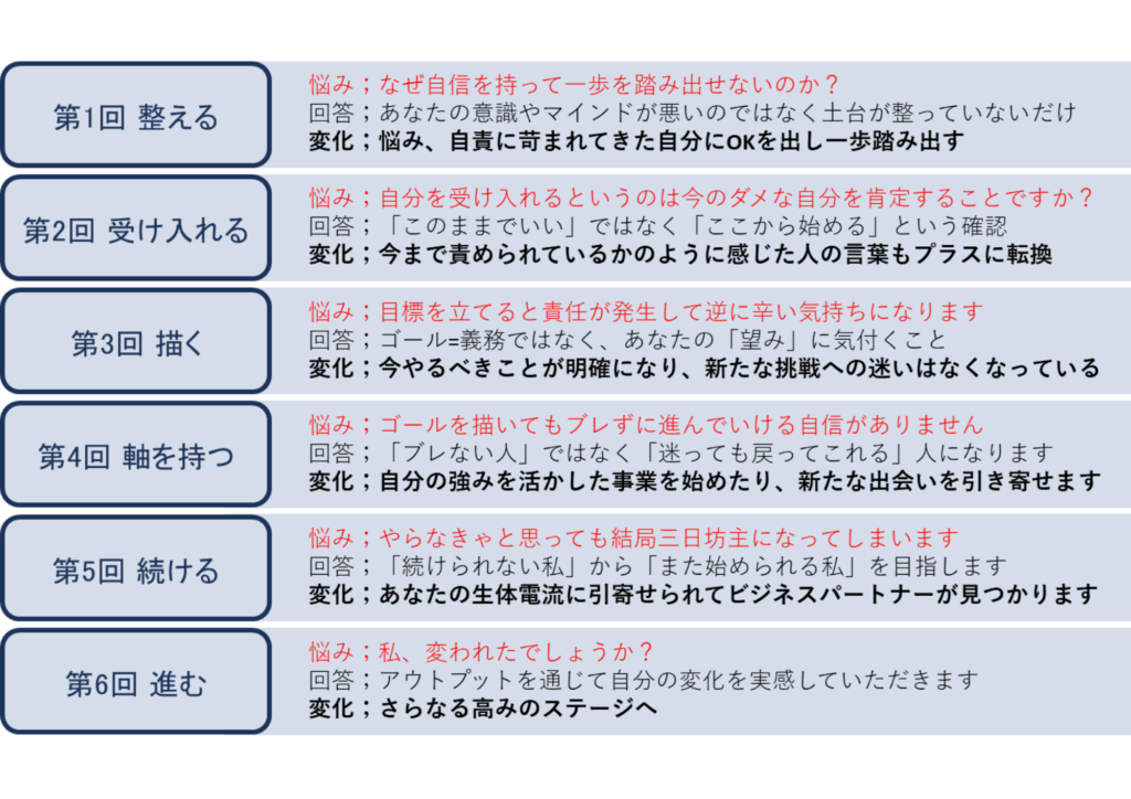 本プログラムは、あなたの中の「引き寄せの磁場」と「行動の流れ」を整えるために、6つのステップを踏んで少しずつ人生の土台を再構築していきます。